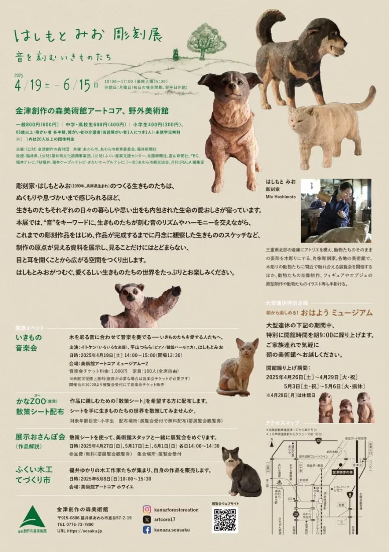 本展では、“音”をキーワードに、生きものたちが刻む音のリズムやハーモニーを交えながら、 これまでの彫刻作品をはじめ、生きもののスケッチなどを展示します。